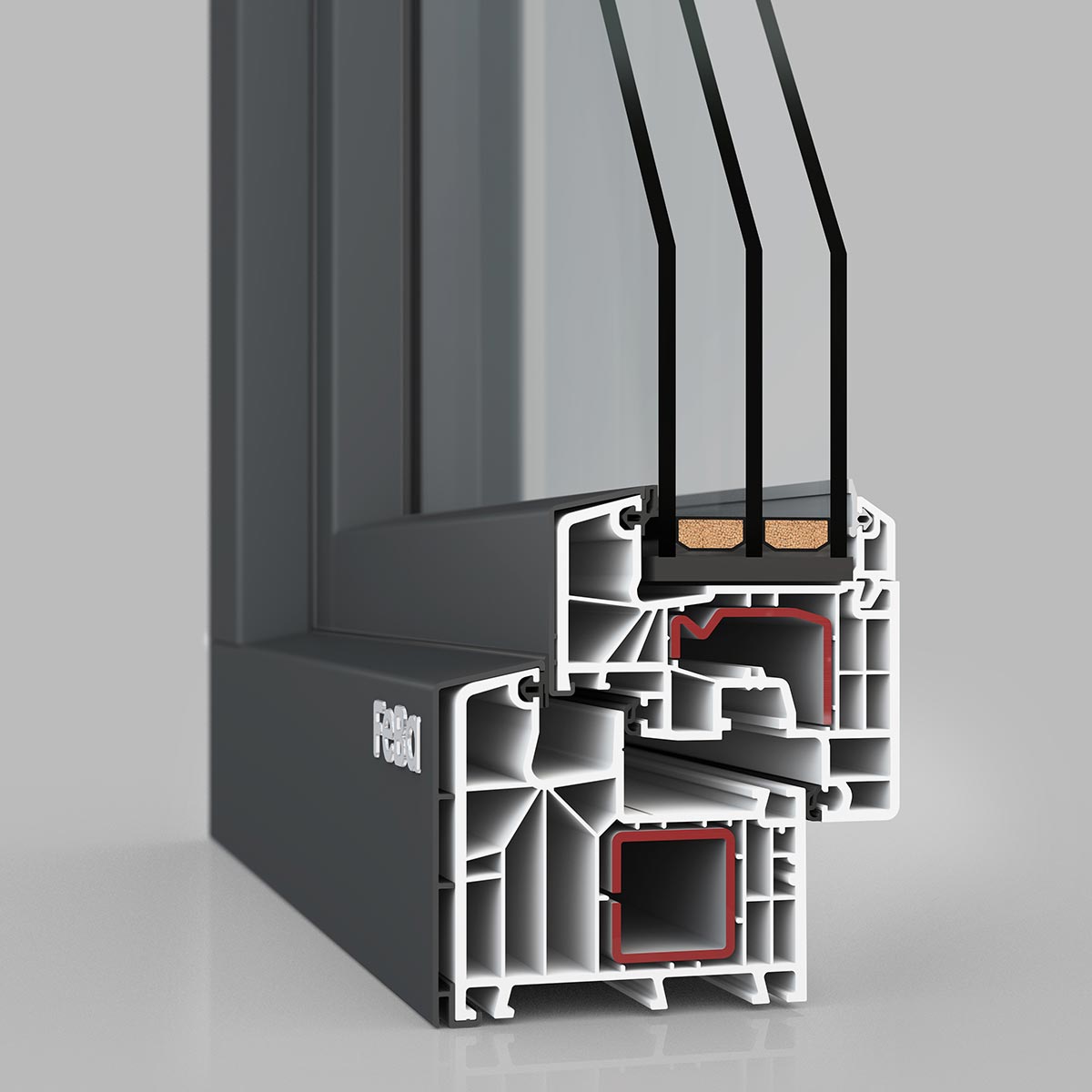 • Verstärkung aus Stahl/Glasfaser – verleiht Flügel und Rahmen Stabilität und Steifigkeit. Dank der robusten Beschläge schließt das Fenster leicht und absolut dicht ab und die FeBa-Kralle schütz vor dem Aushebeln von außen.
